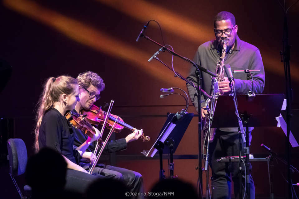 W drugiej części koncertu obok amerykańskiego saksofonisty pojawiło się czworo wrocławskich muzyków: Kwartet Lutosławskiego. Artyści zagrali premierowe kompozycje na saksofon i kwartet smyczkowy. To było wielkie wyzwanie zgrać ze sobą tak odmienne style muzyczne. Artyści dali z siebie wszystko, by premierowa kompozycja zabrzmiała pięknie.