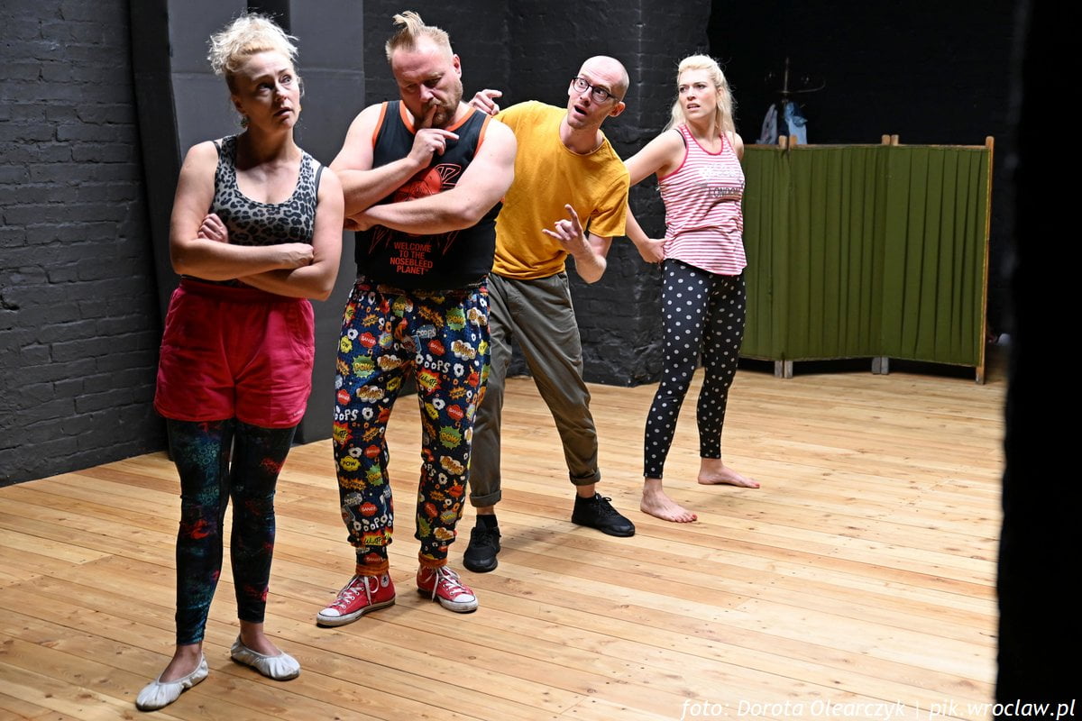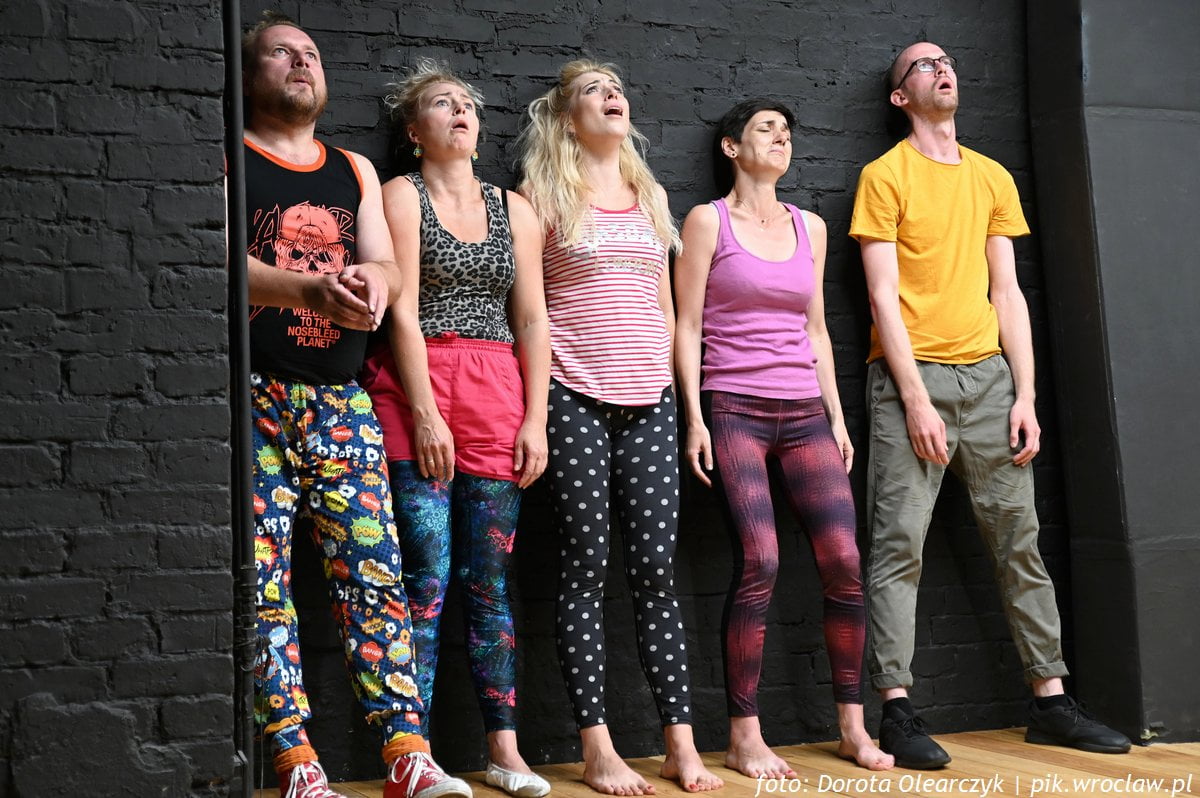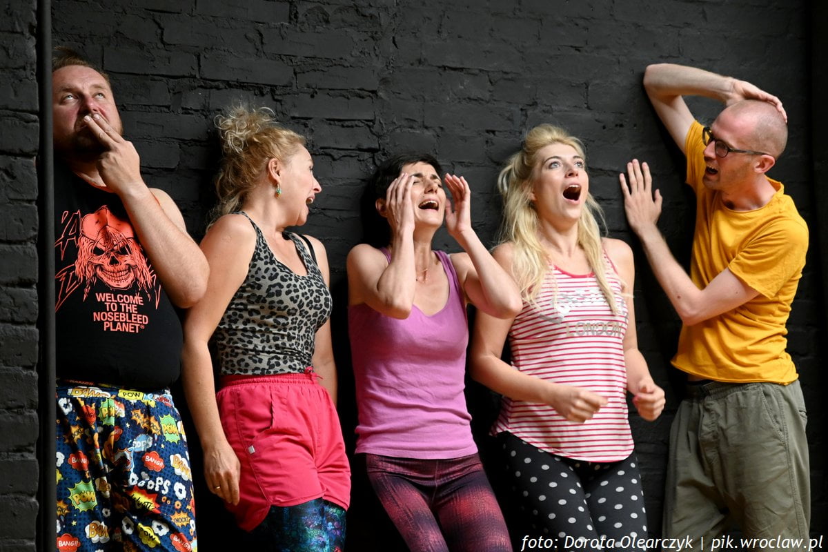 Po wejściu na czwarte piętro WTW, a przed wejściem na widownię Sceny na Stychu, otrzymujemy do dyspozycji m.in. pomidorki, którymi możemy wyrazić niezadowolenie z tego, co oglądamy, rzucając je w stronę aktorów (po prapremierze nikt nie skorzystał z owoców zgodnie z zaleceniem). Potem twórcy torpedują nas serią kilkusekundowych scen: zaciemnienie – rozjaśnienie – poza – tekst i tak przez kilka minut. Trochę zaczęłam się obawiać, że ta tendencja migającego światła pozostanie już do końca przedstawienia, ale niepotrzebnie. Aktorzy są świetnie wyćwiczeni w charakterystycznych pozach i minach. Bawią i zakorzeniają w nas w komiksowej konwencji. Poznajemy kolejne osoby i ich traumy wypowiadane lub wykrzykiwane jak krótkie dymki nad rysunkiem.