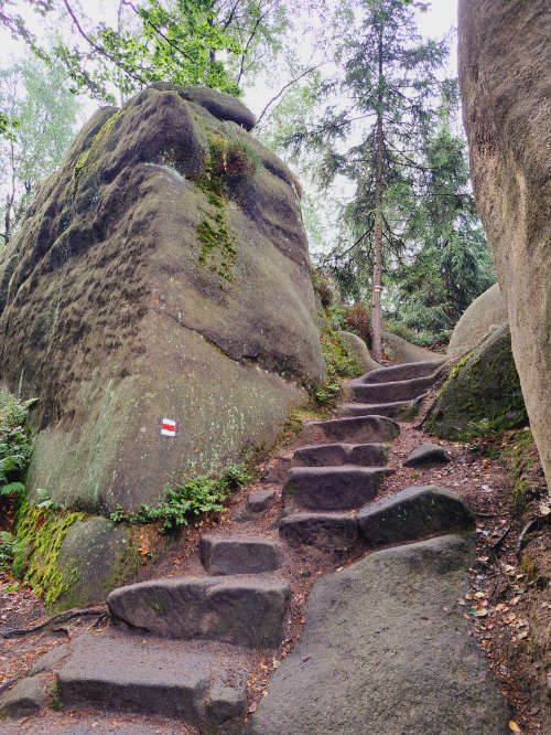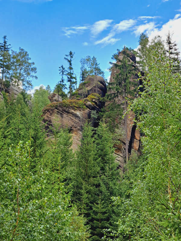 Dalej kontynuujemy wędrówkę czerwonym szlakiem aż do Hajkovej Rokli, gdzie odbijamy na szlak żółty prowadzący do Vyhlídki Ovčín. Tam znów podziwiamy panoramę Kotliny Broumovskiej i wracamy żółtym szlakiem do Suchodolskiej Niagary (czasowo wyschnięty wodospad).