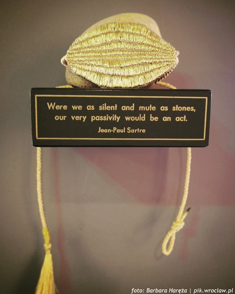 Szanując w pełni stanowisko zespołu galerii, nie pozostaje nam nic innego, jak wsłuchać się w głos wystawy. Głos wzmocniony wydźwiękiem jednej z prezentowanych prac – instalacji Kariny Marusińskiej zatytułowanej „Cisza”. To kamień wielkości wypełniającej dłoń oraz proca, które w połączeniu ze słowami Jeana Paula Sartre’a „Choćbyśmy siedzieli cicho i bez słowa, jak kamienie, wówczas i tak działalibyśmy przez naszą bierność”, stają się symbolem milczącego protestu i jednocześnie symbolem wystawy.
