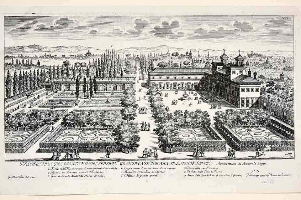 Druga część wystawy przenosi widzów do renesansowej włoskiej willi – nowego typu rezydencji powiązanej z ogrodem, który narodził się w XV wieku w Italii, a w stuleciu następnym w wielkiej liczbie opanował także wzgórza Rzymu i jego okolice. Te zachwycające założenia pałacowo-ogrodowe były częstym tematem graficznych przedstawień. Na wystawie możemy obejrzeć plan i widok nimfeum w Villi Giulii – jednej z najważniejszych dla rozwoju nowożytnej architektury rezydencjonalnej (projektowanej przez zespół znakomitych architektów pod kierunkiem Giorgia Vasariego), XVI-wieczny miedzioryt przedstawiający Villę Medici, autorstwa znakomitego, wywodzacego się z Florencji rysownika i rytownika – Antonia Tempesty, XVII-wieczne akwaforty z wydanego w 1693 roku albumuLi Giardini di Roma z widokami wspomnianej Villi Medici, sąsiadującej z nią na Monte Pincio Villi Borghese i Villi Mattei położonej na Monte Celio. Miedzioryty z końca XVIII wieku, autorstwa Domenica Prontiego ukazują słynne renesansowe ogrody tarasowe –Orti Farnesiani na Palatynie i ogrody książąt Colonna na Kwirynale. Prawdziwym rarytasem jest niewielka rycina autorstwa Giacoma Lauro z albumuAntique Urbis Slendor wydanego w 1641 r., drobiazgowo opisująca jedno z najciekawszych założeń ogrodowych, Villę Lante w Bagnaia nieopodal Viterbo – perłę manieryzmu zaprojektowaną przez Jacopa Barozzi da Vignola. Na zakończenie – prawdziwa uczta dla oczu: ryciny pochodzące z dwóch cykli graficznych, które powstały w oparciu o wspaniałe dekoracje malarskie autorstwa Rafaela i jego uczniów. Pierwszy to urzekająca historia miłości Amora i Psyche zilustrowana w formie fresków przez Rafaela na sklepieniu ogrodowej loggii w Villi Farnesinie, tu odtworzona po mistrzowsku w technice akwaforty przez Nicolasa Dorigny’ego. Drugi powstał w oparciu o wspaniałe ornamentalne, groteskowe dekoracje Loggii Rafaela w Pałacu Watykańskim. Autorami tych znakomitych graficznych interpretacji rafaelowskich fresków są wybitni rzymscy artyści działający w 2. połowie XVIII wieku: Pietro Camporese, Gaetano Savorelli i Giovanni Ottaviani.