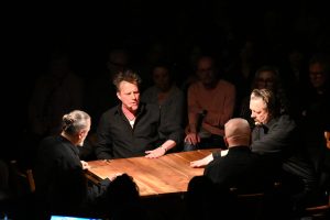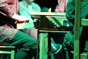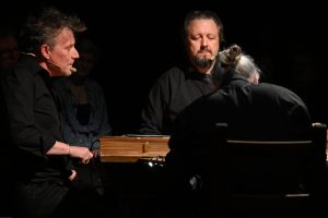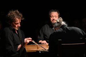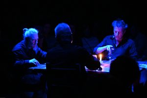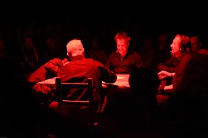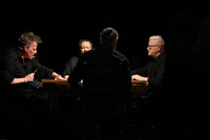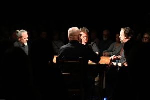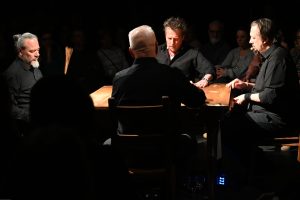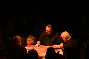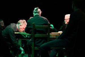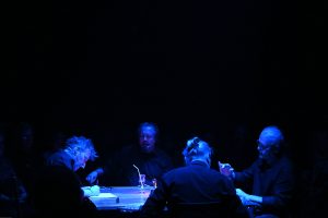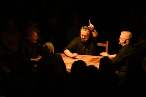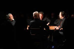 To sztuka niemal bez słów, a jednak opowiadająca o rzeczach najważniejszych, o relacjach, o wspólnocie, o tym, co łączy, o odchodzeniu, biesiadowaniu, zabawie, szaleństwie… to przedstawienie o ponadczasowym ładunku treści i sensów. Kunszt i mistrzostwo wykonawcze emanują od czwórki panów siedzących na drewnianych prostych krzesłach przy drewnianym, wydawałoby się, prostym stoliku. Jednak szybko okazuje się, że i panowie nie są zwykłymi biesiadnikami i że stolik nie jest grubo ciosanym starym meblem kuchennym. Staje się na naszych oczach kunsztownym instrumentem muzyczny w rękach wybitnych graczy.