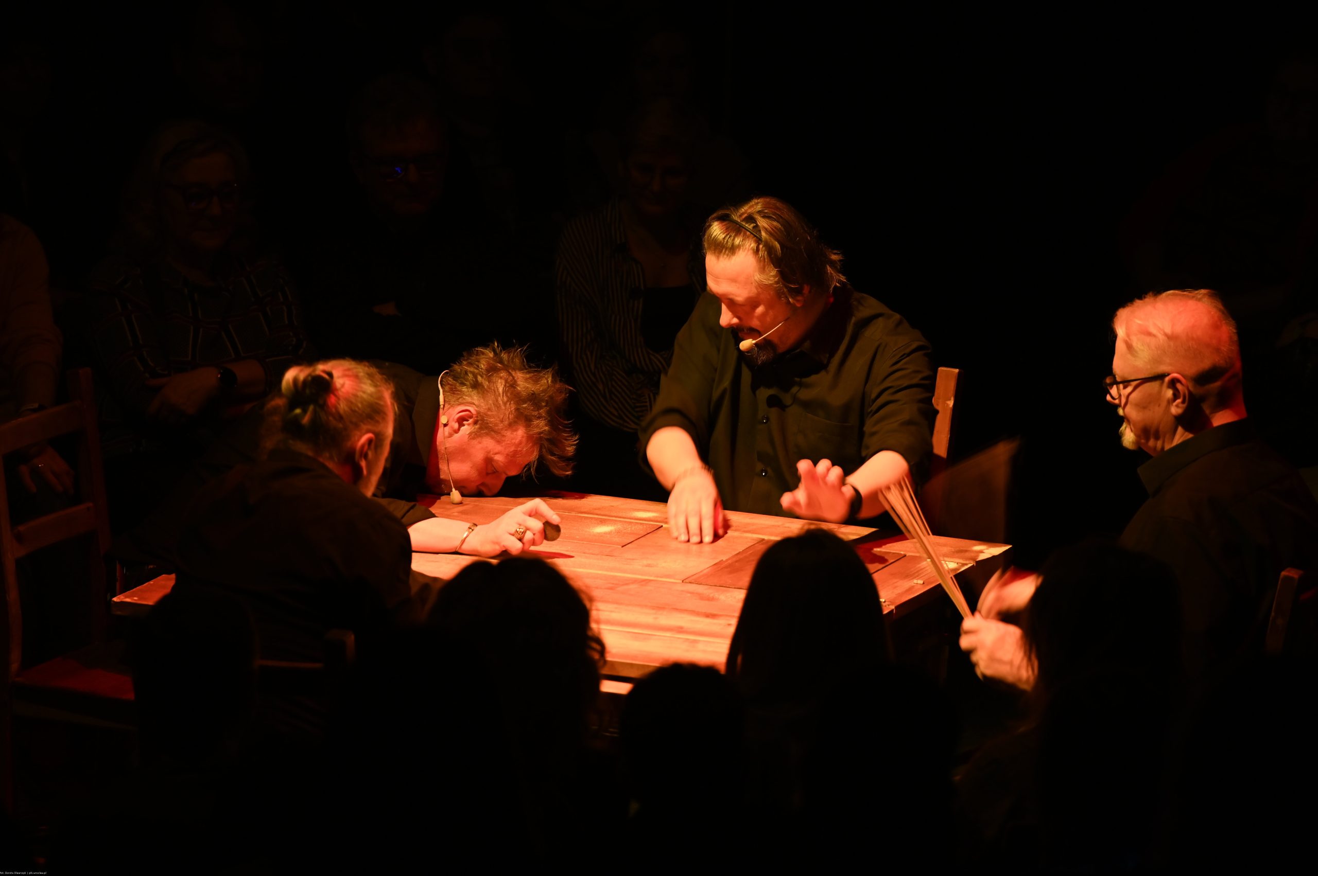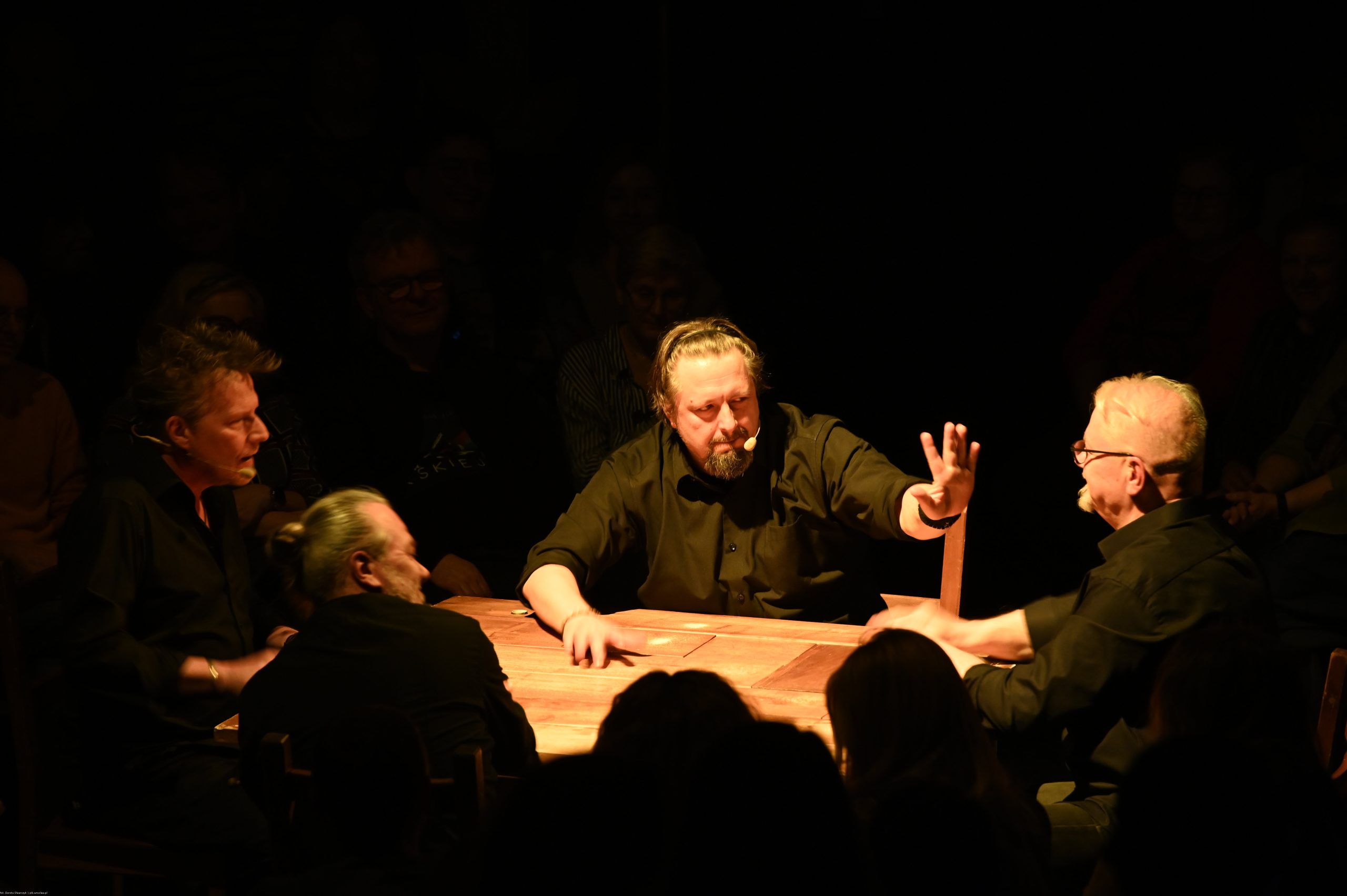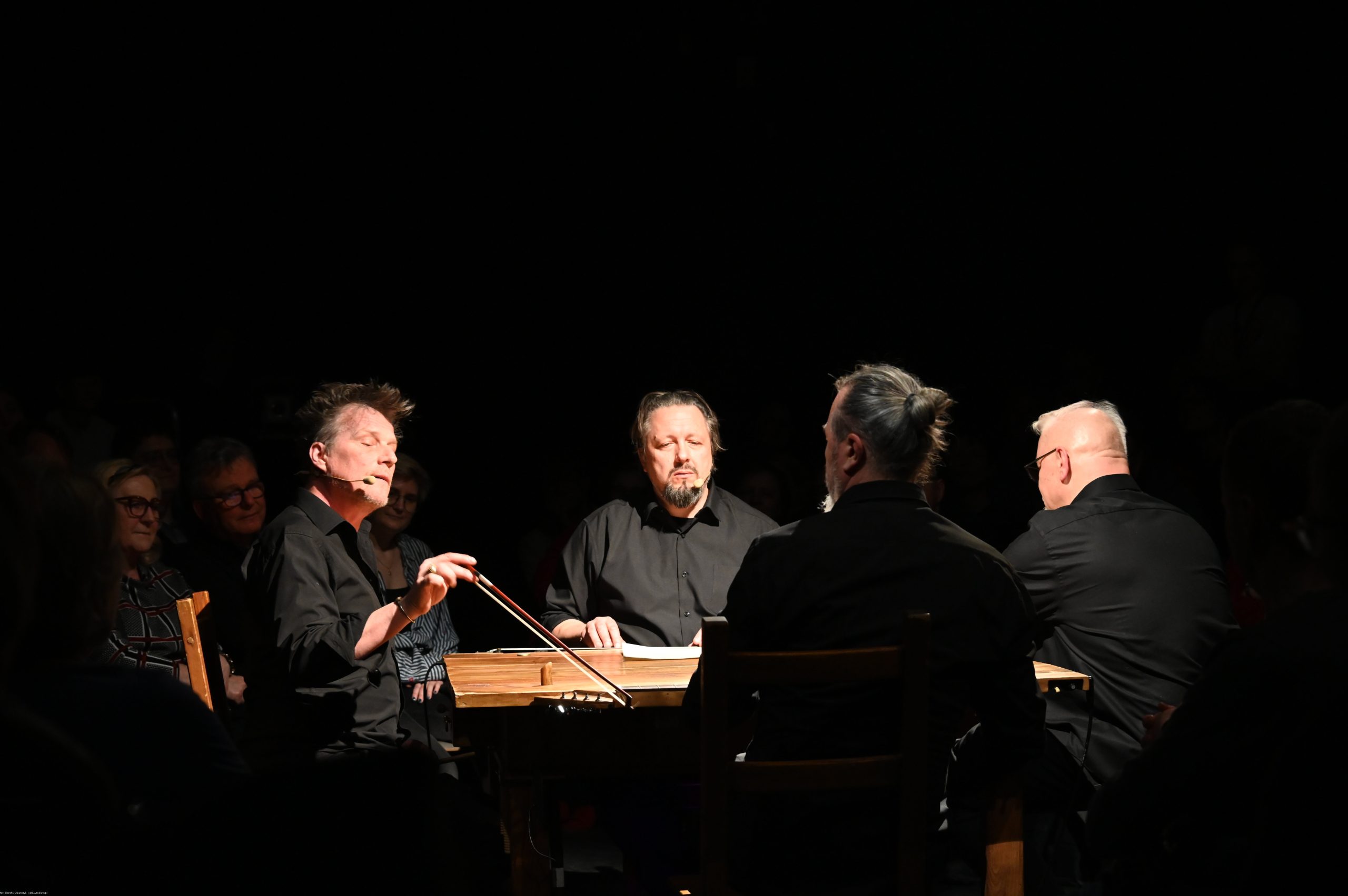To sztuka niemal bez słów, a jednak opowiadająca o rzeczach najważniejszych, o relacjach, o wspólnocie, o tym, co łączy, o odchodzeniu, biesiadowaniu, zabawie, szaleństwie… to przedstawienie o ponadczasowym ładunku treści i sensów. Kunszt i mistrzostwo wykonawcze emanują od czwórki panów siedzących na drewnianych prostych krzesłach przy drewnianym, wydawałoby się, prostym stoliku. Jednak szybko okazuje się, że i panowie nie są zwykłymi biesiadnikami i że stolik nie jest grubo ciosanym starym meblem kuchennym. Staje się na naszych oczach kunsztownym instrumentem muzyczny w rękach wybitnych graczy.
