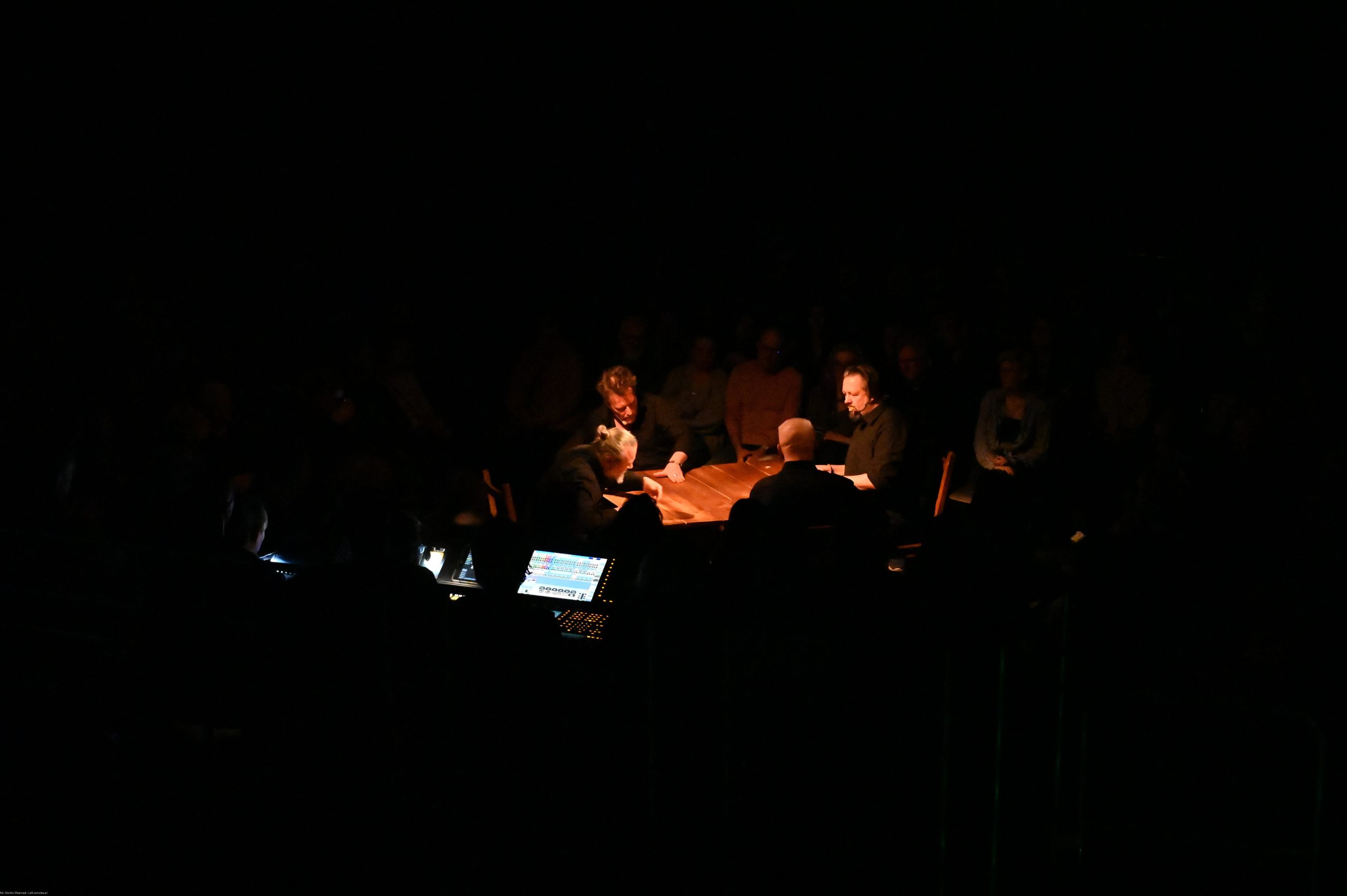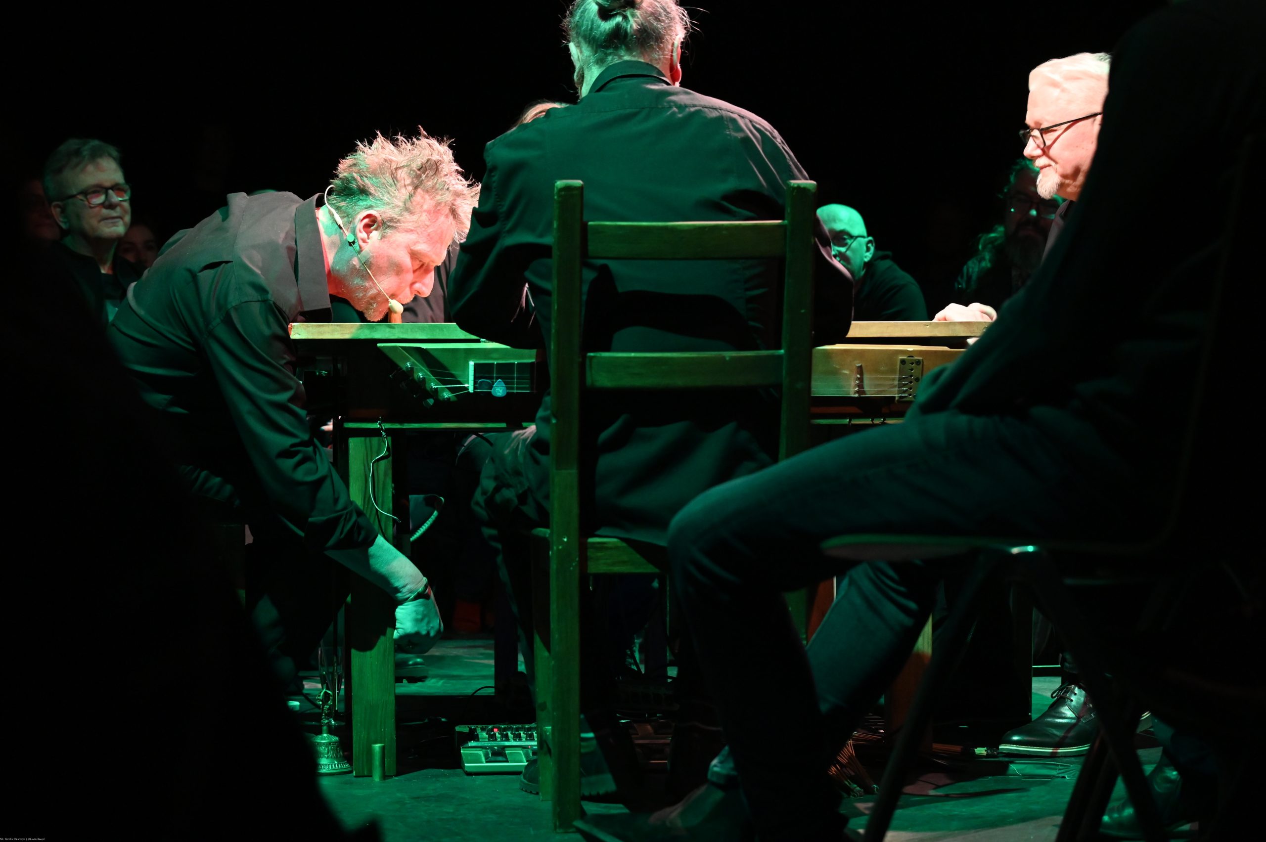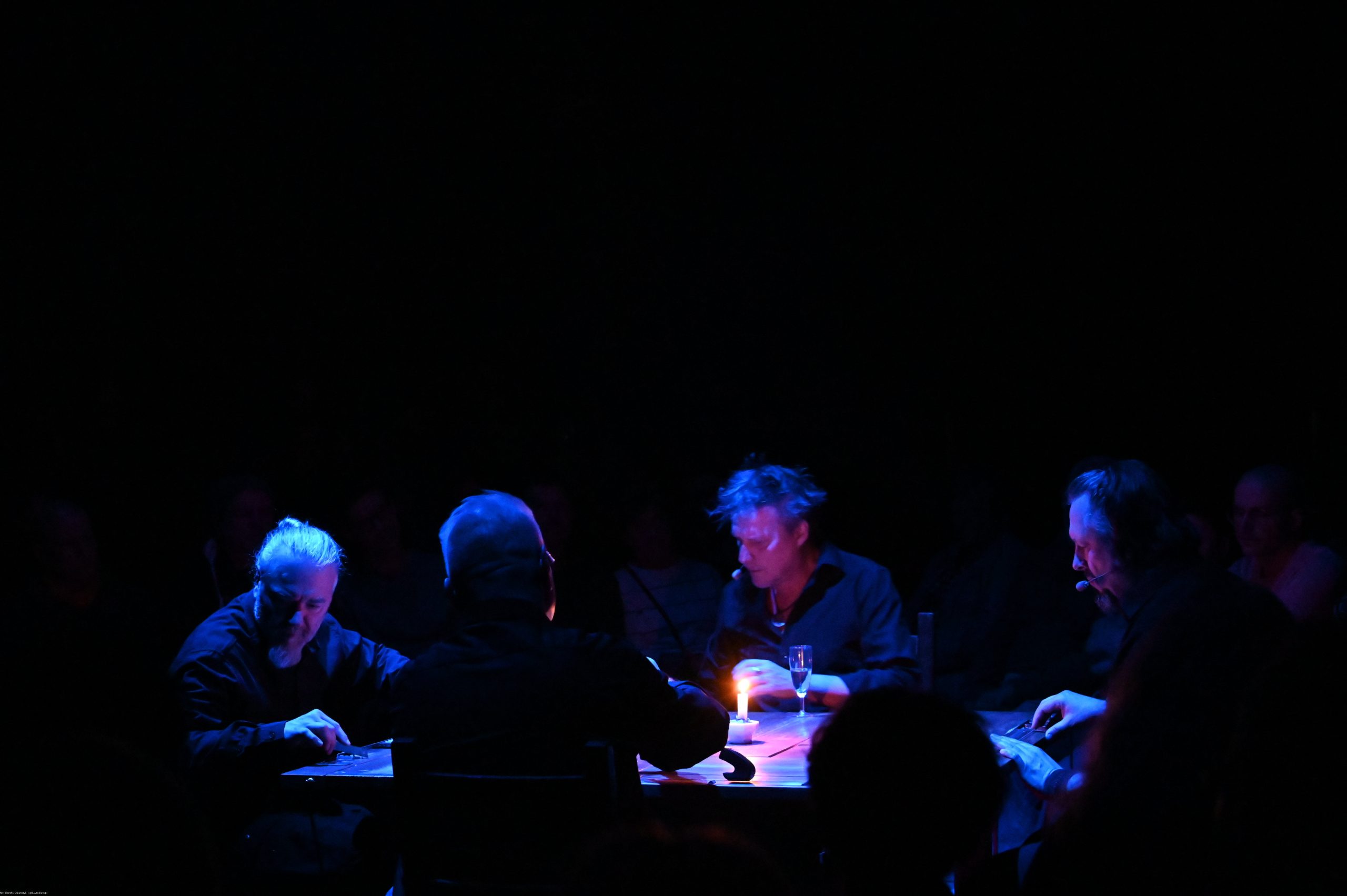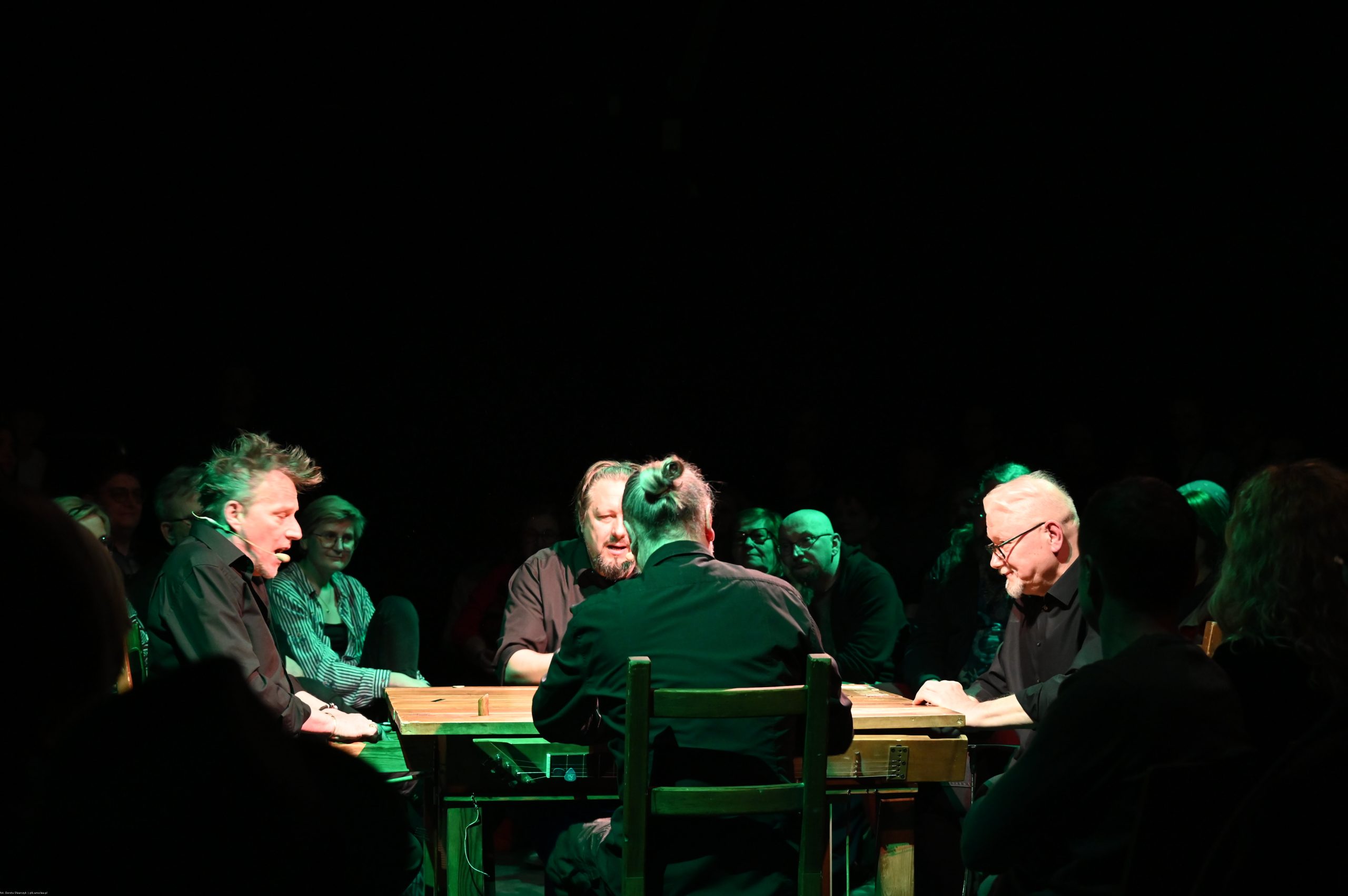 To sztuka niemal bez słów, a jednak opowiadająca o rzeczach najważniejszych, o relacjach, o wspólnocie, o tym, co łączy, o odchodzeniu, biesiadowaniu, zabawie, szaleństwie… to przedstawienie o ponadczasowym ładunku treści i sensów. Kunszt i mistrzostwo wykonawcze emanują od czwórki panów siedzących na drewnianych prostych krzesłach przy drewnianym, wydawałoby się, prostym stoliku. Jednak szybko okazuje się, że i panowie nie są zwykłymi biesiadnikami i że stolik nie jest grubo ciosanym starym meblem kuchennym. Staje się na naszych oczach kunsztownym instrumentem muzyczny w rękach wybitnych graczy.