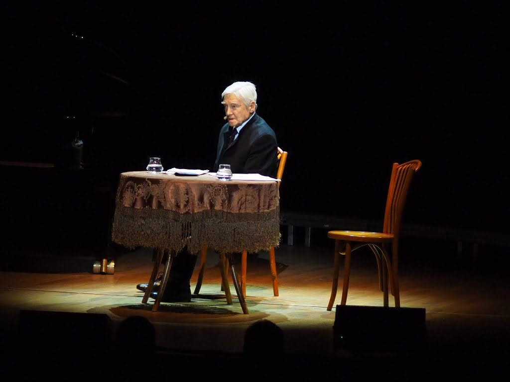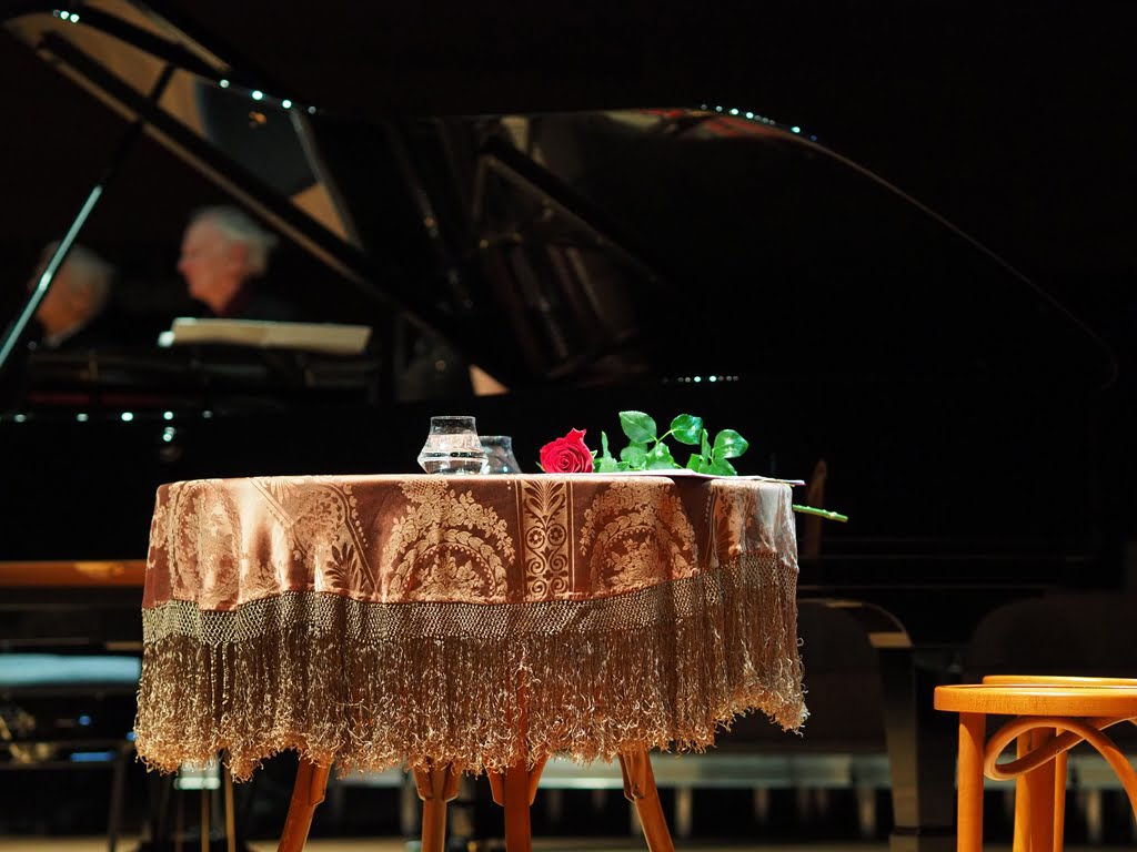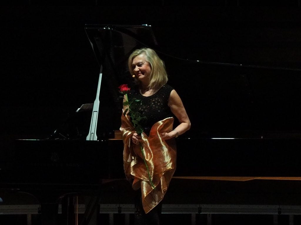 Do tego bardzo skromna, wręcz ascetyczna scenografia. Jedynie, tylko od czasu do czasu oświetlony, mały stolik „ z epoki”. Bardzo skromne oświetlenie w przeogromnej Sali Głównej NFM stwarzało zbyt kameralny nastrój. Warto przypomnieć, to była Pieśń o życiu i śmierci Chopina. Mimo wspaniałej wirtuozerii Olejniczaka, mazurków, etiud, polonezów i nokturnów, w całości spektaklu życia, moim zdaniem, trochę zabrakło. Zwykła gra świateł mogłaby wzbogacić przesłanie i ożywić to dość długie spotkanie.