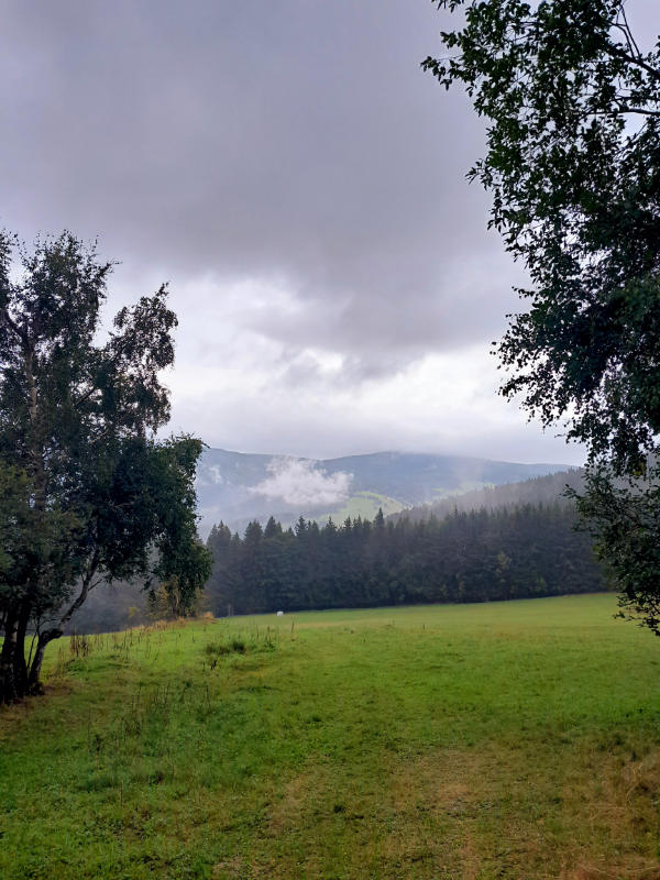 Wycieczkę zaczynamy na parkingu w centrum Zacleřa. Ruszamy na północ główną ulicą miasteczka i po chwili skręcamy pod górkę w lewo w zielony szlak. Na początek czeka nas dość strome podejście leśną drogą. Po drodze odbijamy kawałek do historycznego źródła Bobru. Miejsce nie jest może super ciekawe, ale warto je „zaliczyć” . Dalej szlak prowadzi nas Zacleřskim Grzbietem w stronę Chaty Hubertus i górską łąką do skrzyżowania przy Rychorskim Krzyżu. Tam skręcamy w lewo i trzymając się dalej zielonego szlaku podążamy szeroką, wygodną drogą do kolejnego rozwidlenia. Tym razem skręcamy w prawo i dochodzimy do klimatycznego schroniska Rychorska Bouda. Przy schronisku mamy dwie atrakcje, funkcjonującą stację pomiarową czeskiego urzędu hydrometeorologicznego z pomiarem parametrów meteorologicznych i zanieczyszczenia powietrza i platformę widokową z panoramą Karkonoszy.