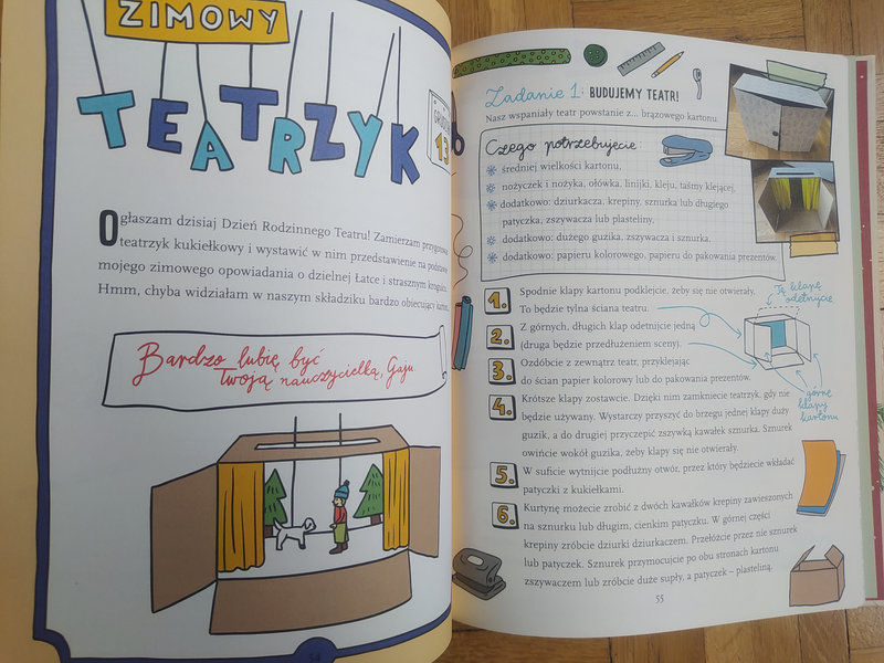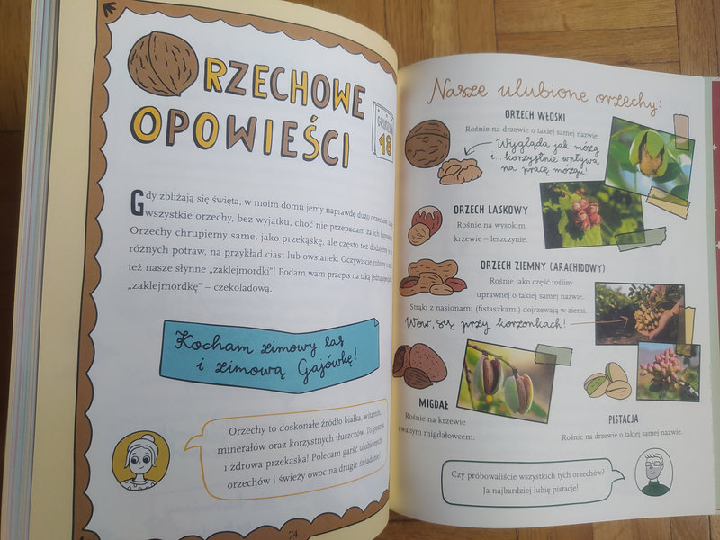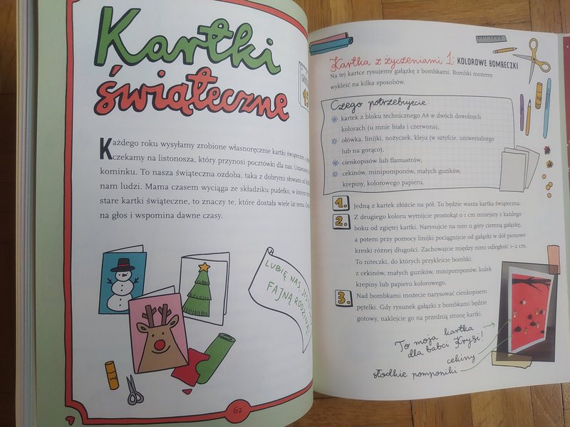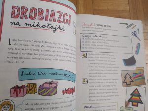 Ilustracje Kasi Piątek dodają uroku publikacji, w której znajdziecie m.in. porady, jak przygotować Słoik Dobrych Myśli, jak napisać zimowe opowiadanie, jak upiec pierniczki, zrobić ozdoby świąteczne z szyszek, patyków i kamyków.