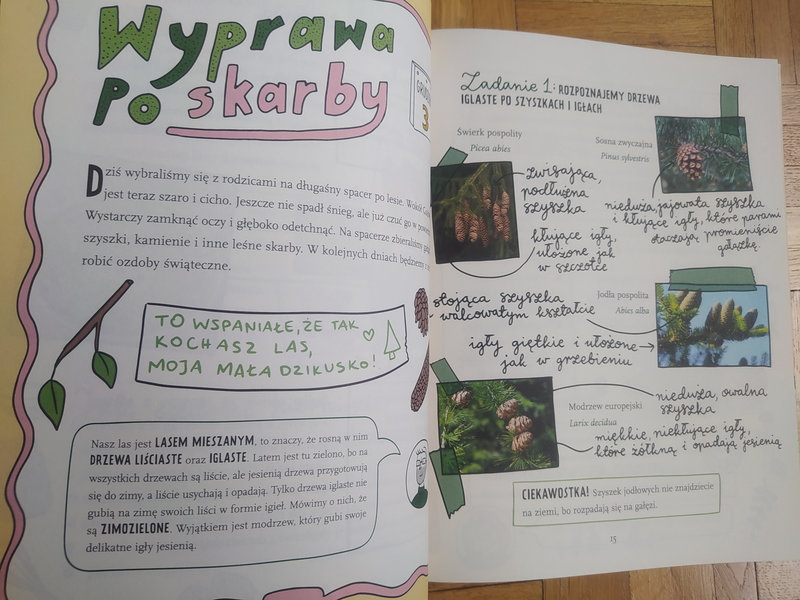 Przy okazji wspólnego czytania dowiecie się skąd pochodzi cynamon, imbir czy kardamon, jak wygląda szyszka świerku, sosny, jodły czy modrzewiu. Możecie ułożyć ścieżkę sensoryczną na spacerze po lesie i przygotować niezbędnik obserwatora przyrody. Wykonać kartki świąteczne, przyrządzić owsiankę i napary. Zabawić się w tropiciela wilka, zająca i kuny. Poczytać o zwyczaju ubierania choinki i sposobach pakowania prezentów. Zrobić falbankę na pierogu.