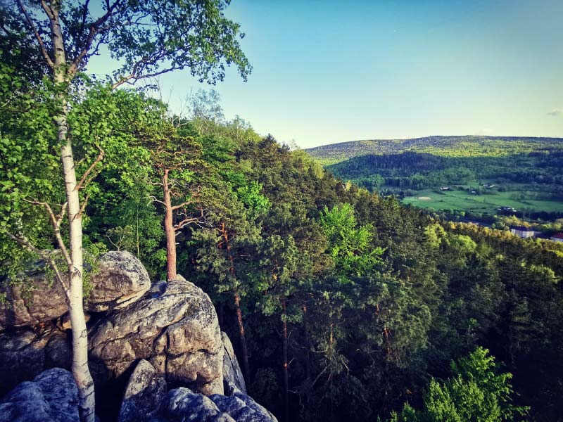 Tam będziemy mieli doskonałą okazję na śniadanie z pięknym widokiem. Dalej czerwonym szlakiem przez Wolarz maszerujemy w kierunku Polanicy-Zdroju, gdzie docieramy po kilku godzinach spokojnej wędrówki, w trakcie której mamy niezliczone okazje do kontemplacji piękna przyrody. W Polanicy zmieniamy szlak na żółty, przekraczamy most na Bystrzycy Dusznickiej, mijamy park zdrojowy i udajemy się w drogę powrotną. Po kolejnych paru godzinach trekkingu docieramy do malowniczo położonego Zamku Leśna Skała w Szczytnej. Przy okazji warto również wspiąć się na punkt widokowy Orle Skały. Ze Szczytnej kierujemy się dalej żółtym szlakiem przez Druciarz aż do Rozdroża pod Nawojową, gdzie zmieniamy kolor szlaku na niebieski, który doprowadzi nas do parkingu w Dusznikach. Proponowana trasa ma ponad 25 km długości, jej fragmenty przebiegają przez miejscowości, częściowo prowadzi mało ruchliwymi drogami asfaltowymi, w większości jednak malowniczymi ścieżkami i drogami leśnymi.