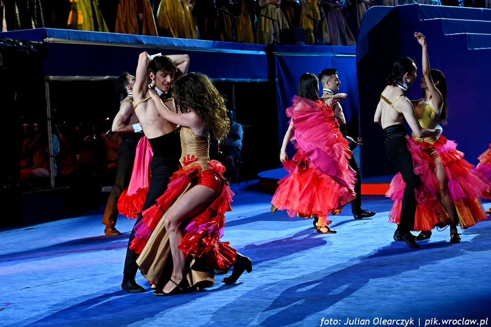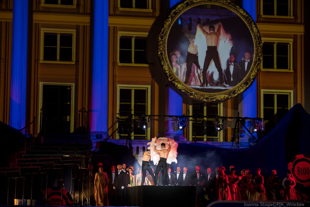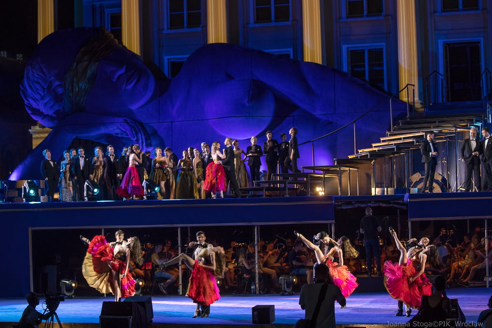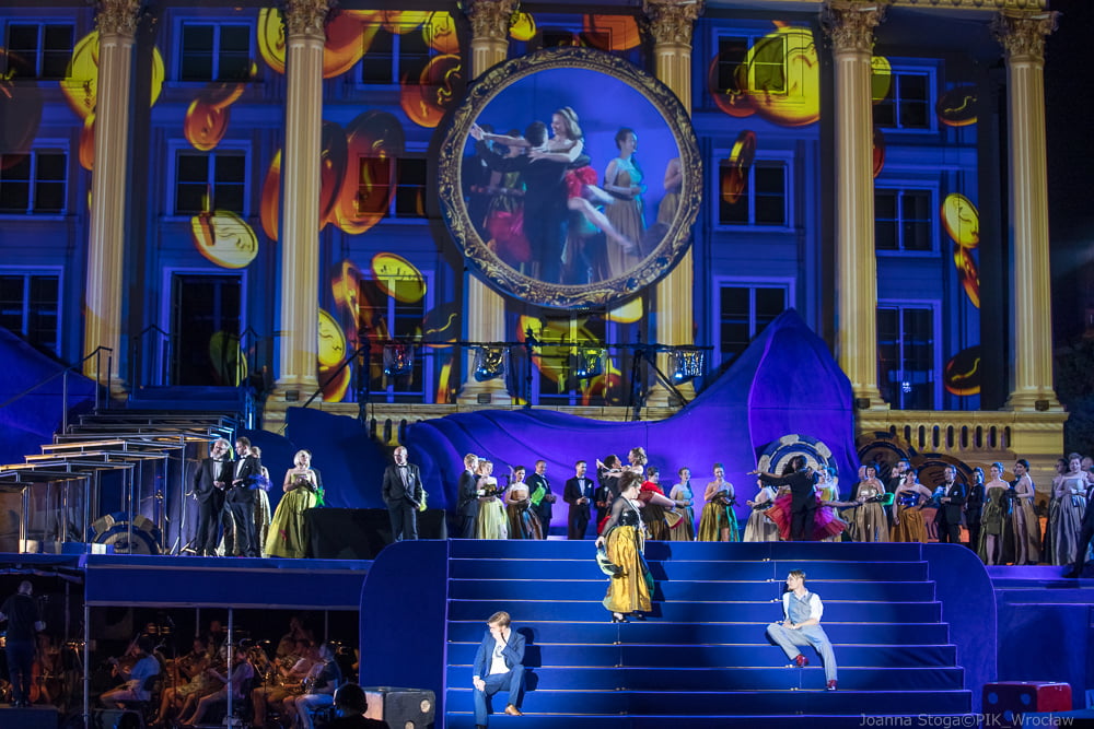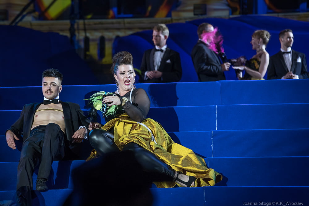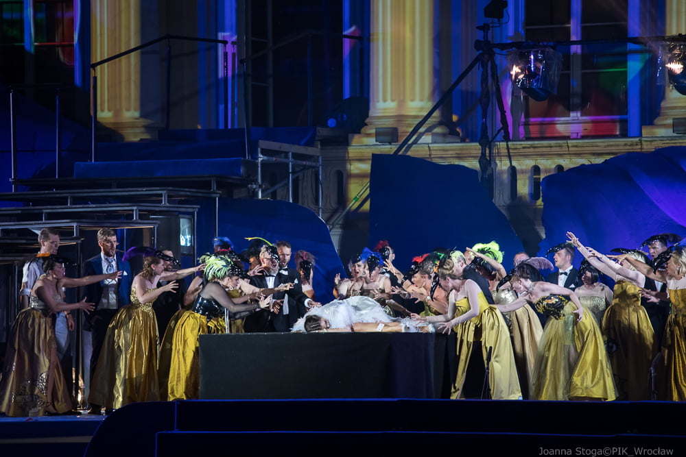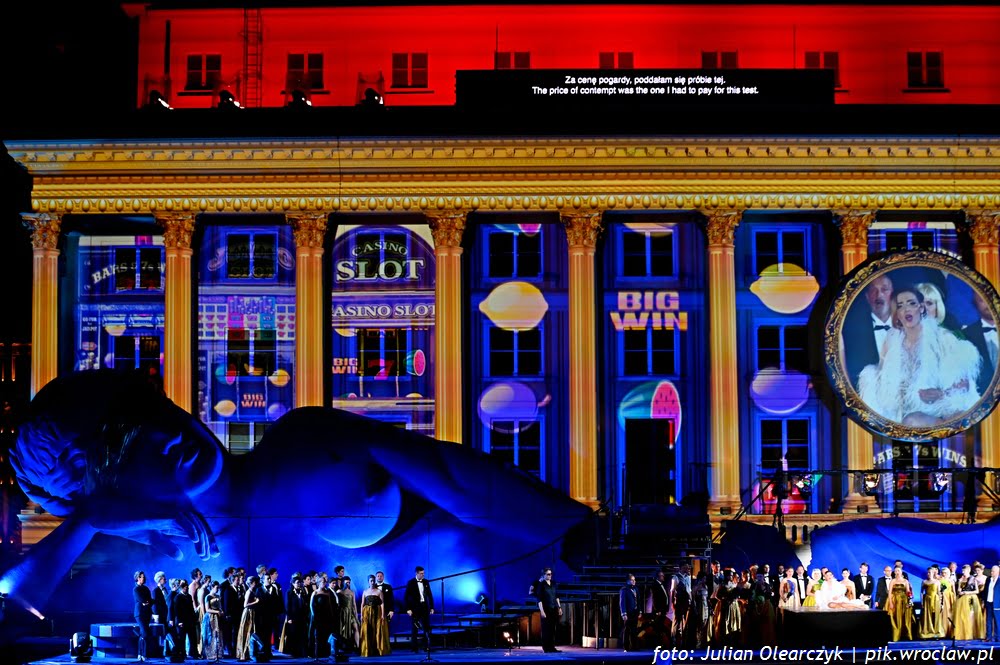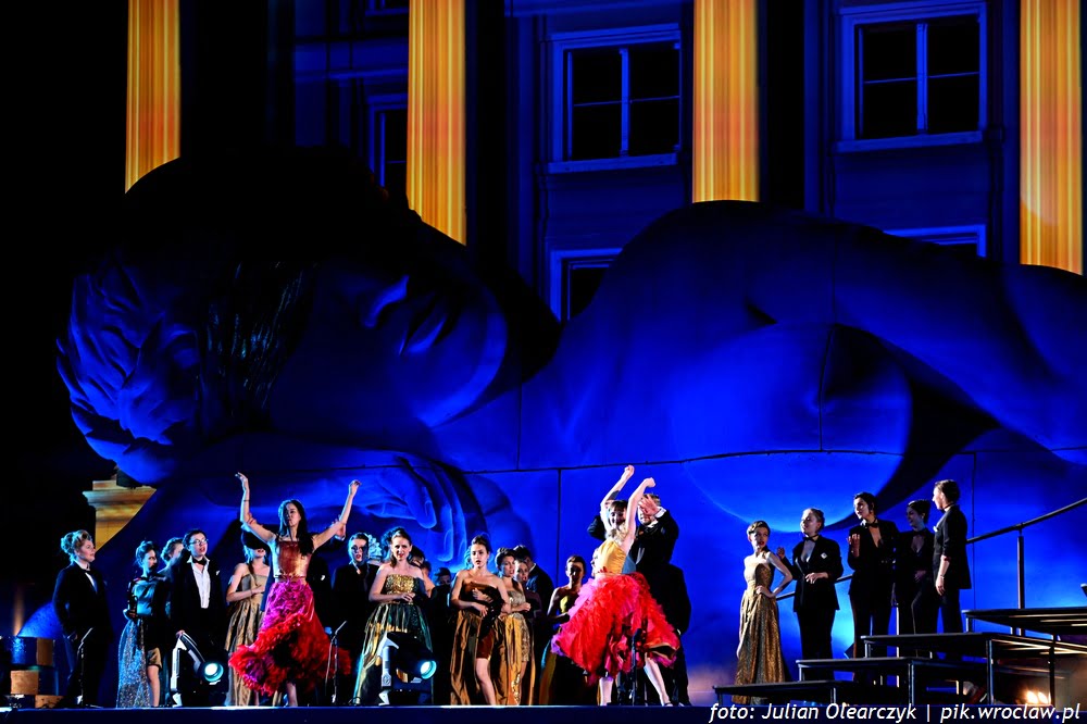 Tancerze przygotowani przez Karola Urbańskiego do niełatwej choreografii na trzech poziomach i na miękkim podłożu, błękitnej sceny dają popis swoich umiejętności w drugim akcie. Włoski dyrygent – Simone Valeri prowadzi orkiestrę z wyczuciem zmiennej dramaturgii. A Renata Vari jako Violetta i Adam Kruszewski jako Giorgio Germont olśniewają barwą i szlachetnością brzmienia w ariach solowych i w duetach. Zjednoczone chóry Opery Wrocławskiej, Politechniki Wrocławskiej i Uniwersytetu Ekonomicznego dobrze korespondują z solistami.