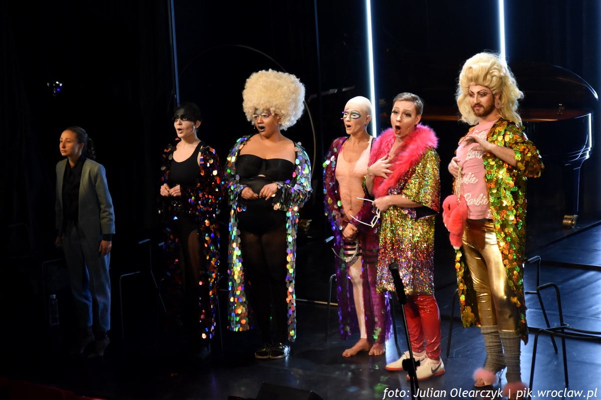Wejście (od strony publiczności) osobliwych postaci na scenę, w efektownym przebraniu innej płci z mocnym makijażem na twarzy, rozpoczyna wrocławskie „Wyzwolenie: królowe”. Spektakularne przesłuchania do roli w spektaklu przynoszą zaskakujące skutki. Słyszymy i widzimy znakomicie śpiewających i poruszających się po scenie drag queensów. Muzyczne miksowanie etiud, preludiów, nokturnu i polonezów chopinowskich z m.in. „Tyle słońca w całym mieście”, „Nie żałuję” („Zamiast”), „Co mi Panie dasz…”, „Wszystko, czego dziś chcę…”, „Mazurkiem Dąbrowskiego”, „Aleją gwiazd”, „Ja mam dwie czułe ręce” to wyśmienite fragmenty nowego „Wyzwolenia”. Zabawne i refleksyjne, dobrze zaśpiewane i zagrane, zakorzeniają widza w happeningowym przedsięwzięciu na blisko dwie i pół godziny.